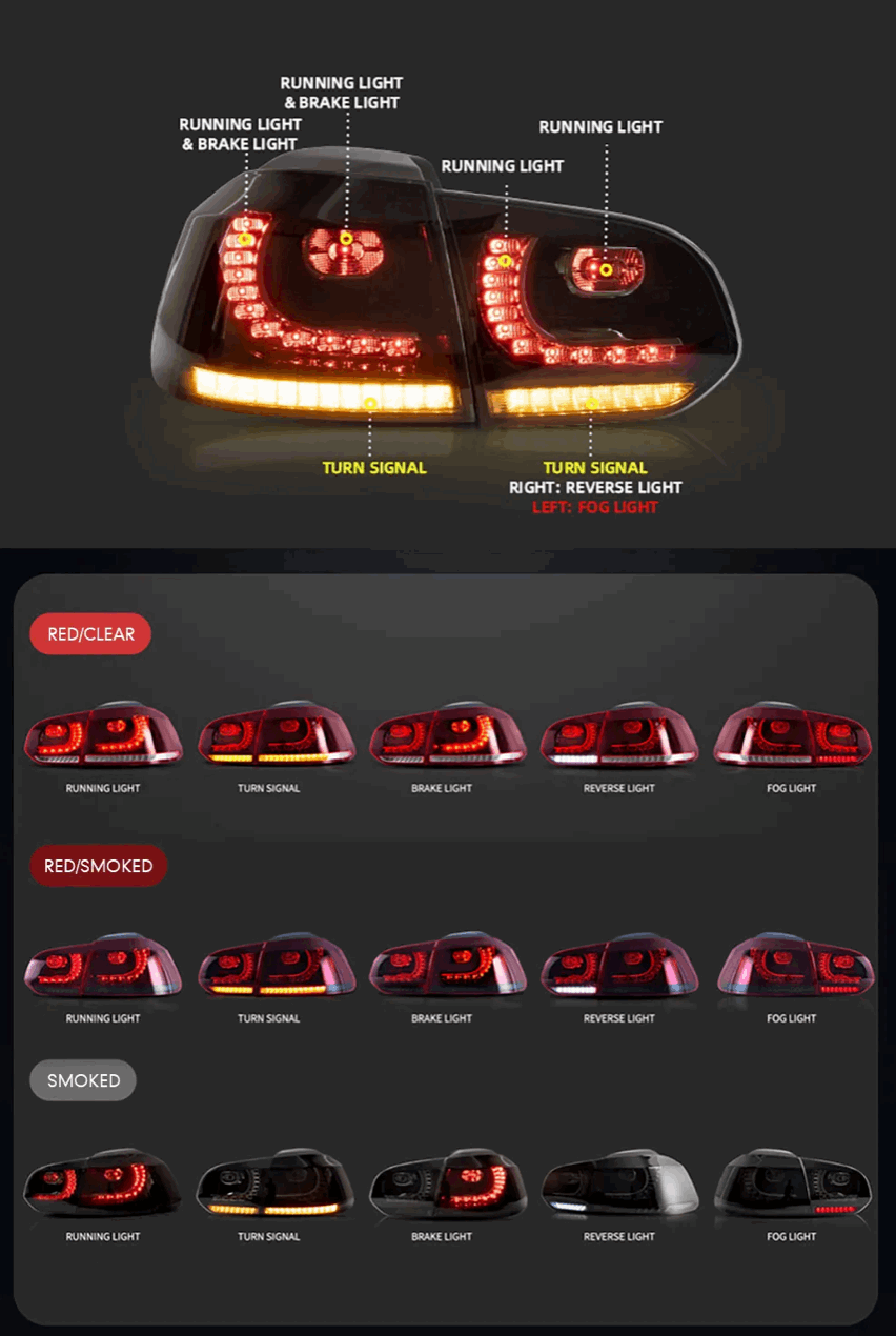 Tailor the look of your Golf to your preference with our options for both smoke and clear lenses. Whether you prefer a darker, more aggressive appearance or a crisp, clean look, you have the choice.